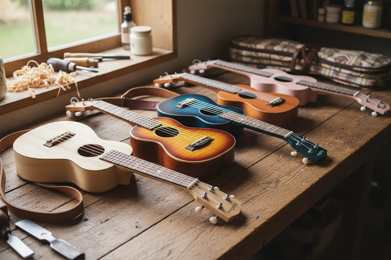 These ukuleles are handcrafted in the heart of central Java, Indonesia, where an entire village community works together to produce each instrument.