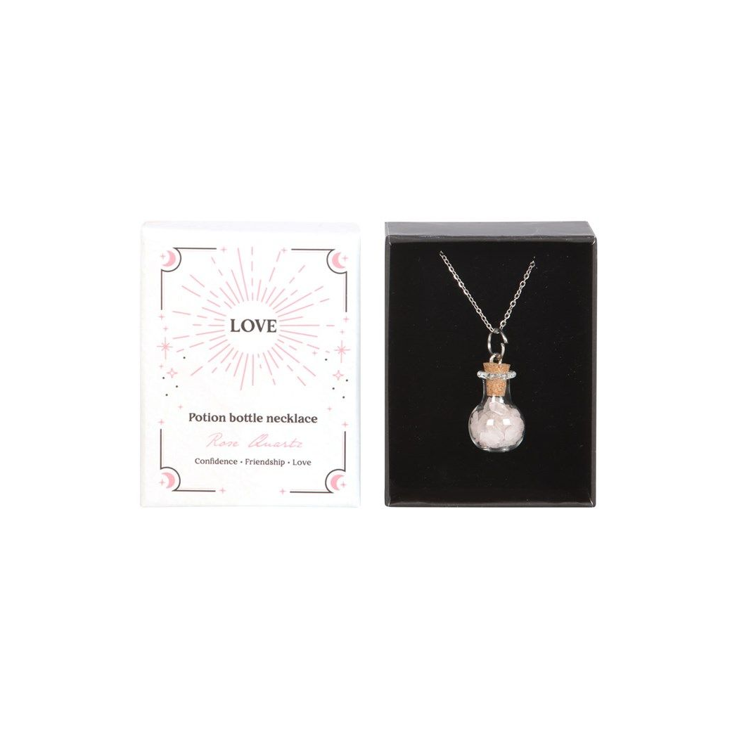 Give the gift of crystal magic with this miniature potion bottle necklace. With natural rose quartz crystal chips and a cork stopper, this necklace serves as a spellbinding accessory while attracting love, friendship and confidence. Presented in a matching gift box and perfect for that special witch in your life. Plastic bottle on a nickel-free stainless steel chain.