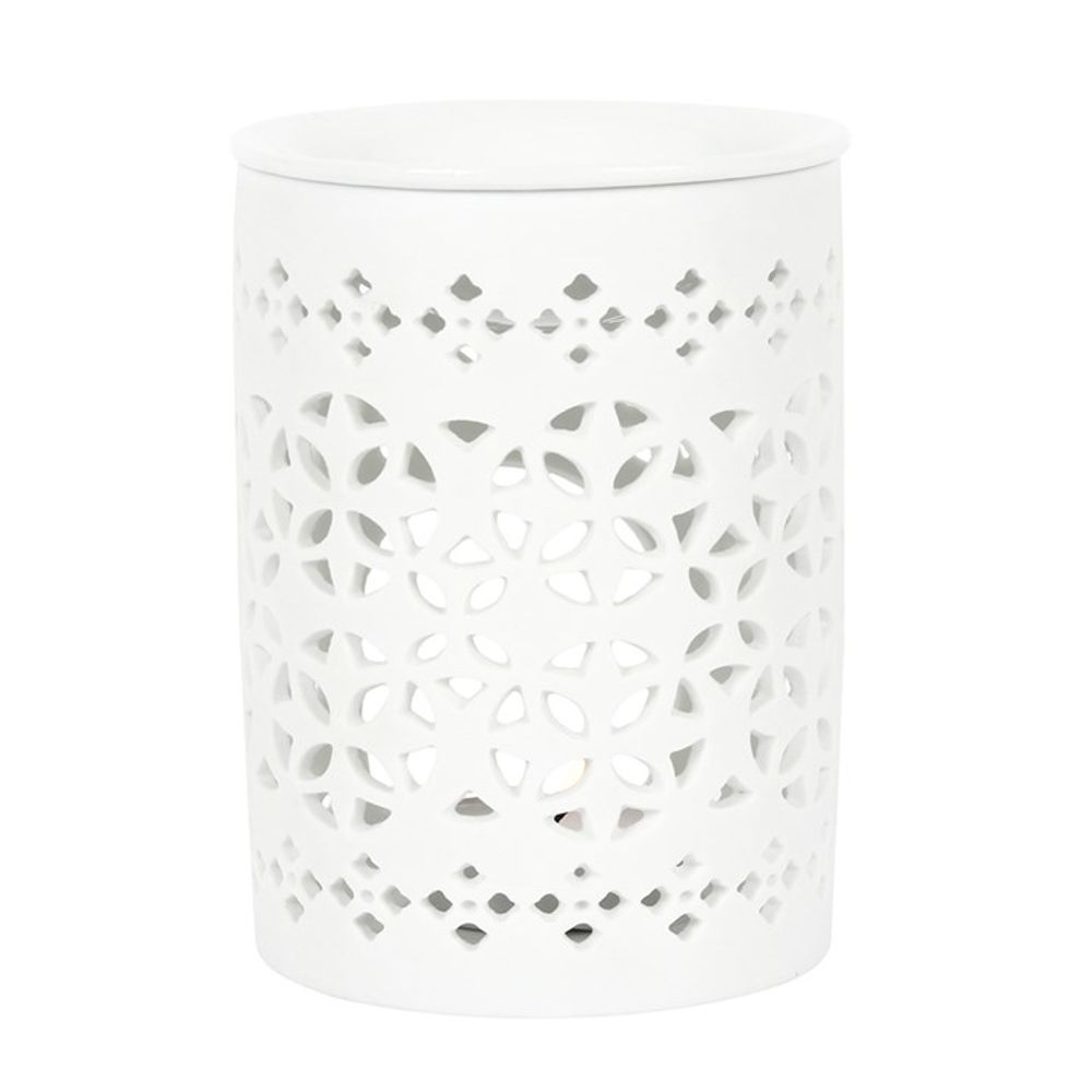 This white matte cut out oil burner will look great in any home. Once a lit tealight is placed inside it casts pretty shadows thanks to the cut out details. This item can also be used as a wax melt burner however it is advisable to consider the size and depth of the bowl when adding wax to ensure it will not overrun the edges when melted. Product Dimensions: H11.5cm x W8.5cm x D8.5cm Packaged Dimensions: H13.5cm x W10.5cm x D10.5cm